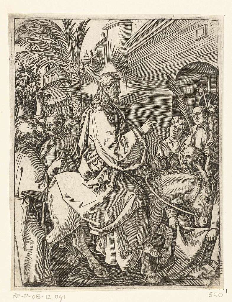 Jesus riding into Jerusalem on a donkey (public domain)